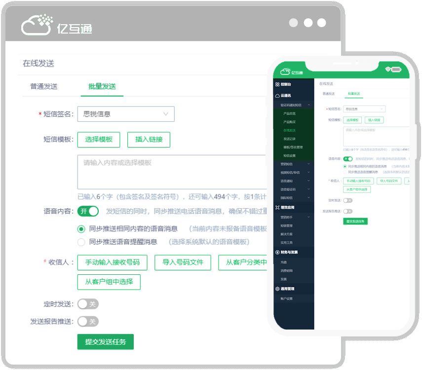 提供簡(jiǎn)單易用的短信API和管理控制臺(tái),靈活選擇下發(fā)方式,可快速上線,免切換環(huán)境,短信后臺(tái)界面清晰,點(diǎn)擊鼠標(biāo),一鍵發(fā)送